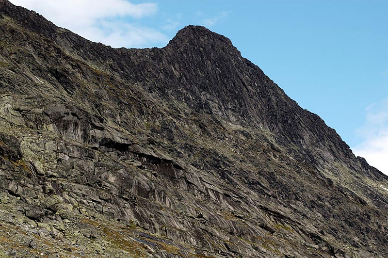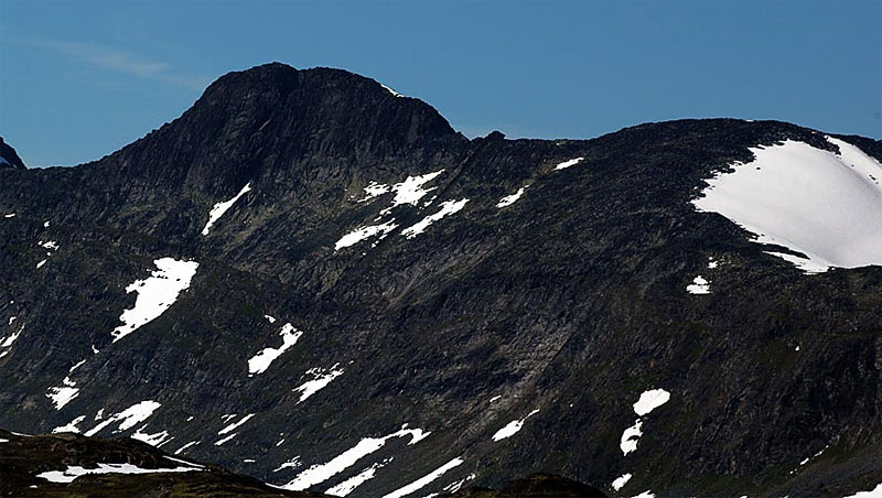 The east ridge is best begun in Gjendebu lodge. Leave the lodge and follow the steep marked path Ra.12 to the prominent nose of Gjendetunga. From Gjendetunga head east across pleasant open tundra dotted with tarns passing north of Grisletjørni lake.