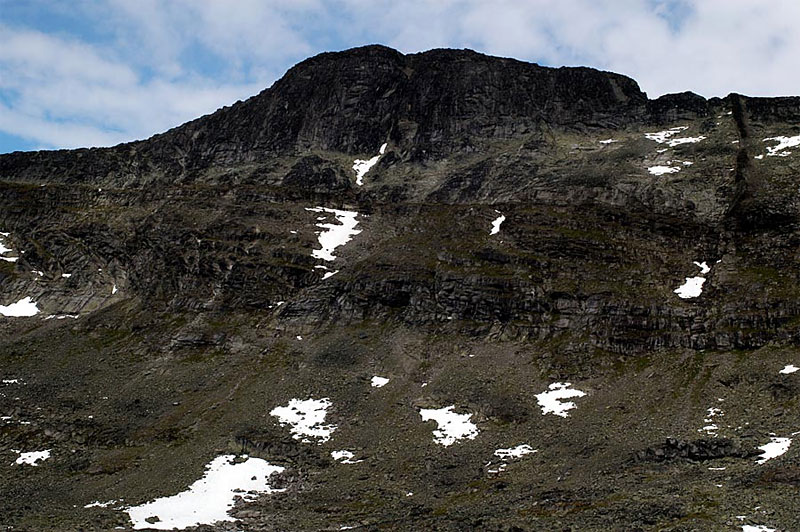 From the top of the gully it is a short easy walk to the summit of Midtre Rauddalseggi. However it is possible to avoid these difficulties by skirting the glacier on the north side well below the ridge at an altitude of about 1700 metres. This would mean traversing the north flank of Østre Rauddalseggi from the 2 lakes on the desolate plateau to the north ridge of Midtre Rauddalseggi, crossing the bottom of the glacier and avoiding the steep wall above its western edge.