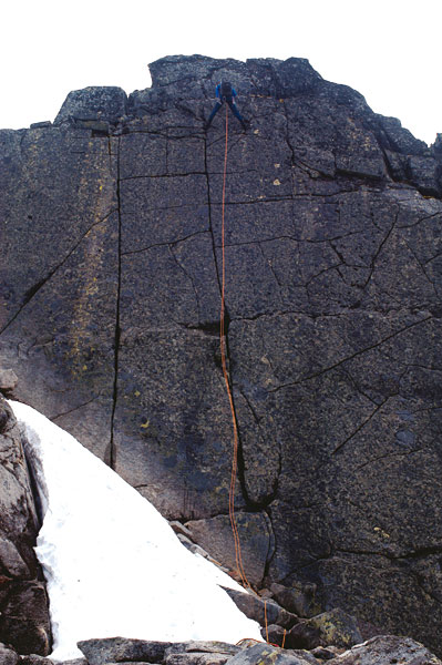 The route I recommend and describe below is Heftyes renne and the 55m abseil. The only drawback is that as the season is short the route might be busy during periods of settled weather during late July to early August.