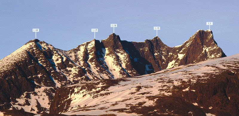The north and south ridges take a good hour to climb while the east ridge is a short ½ hour. To reach any of the three saddles is itself a difficult task and is described in the Storen alternative routes section or on the Sentraltind page.