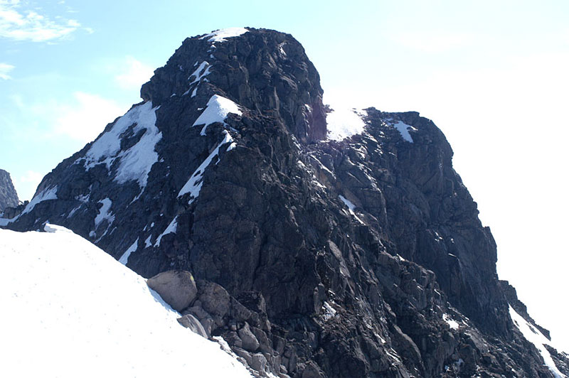 Once the top of this step has been gained it is an exciting but easy walk up the airy arête for 3-400 metres to reach the flat summit.
