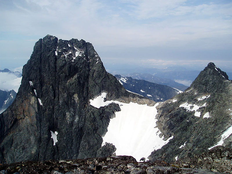 Two considerably longer alternatives are to return to Skagastølsbu shelter via Mohns skar again and then go over Storen, as described on the Storen page, or to return to Turtagrø via the Skagastøls ridge over Vesle, Midtre and Nordre Skagastølstind, also described on the Storen page.