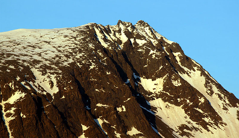 At the bottom of the south ridge is Lovskard saddle which can be descended on the east side via a 40 degree snow/ice filled gully down to Midtmaradalsbreen glacier. The crevassed glacier is then crossed in a north direction to reach the 'Bandet' and then down to Turtagrø. Allow 11-13 round trip from Turtagrø. For those wanting a very demanding, but superb high level traverse, right across Hurrungane, it is possible to continue from Lovskard saddle up Store Midtmaradalstind and then down to Stølsmaradalen cabin.