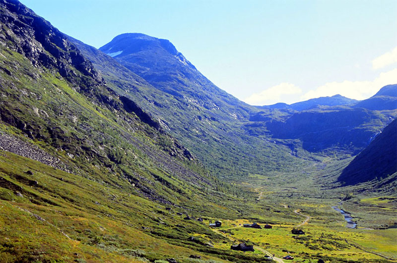 From Turtagrø follow the main road up for 400m until the first corner past the boom. Here on the lower side of the road a rough track gently descends westwards under the main road heading into Helgedalen valley.