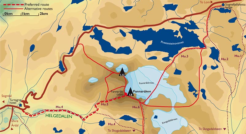 The descent can either be by the same route or via any of the other 3 routes. If you want to be guided down the glacier to Sognefjellshytta during July and August you must be at the cabin before 1100hrs, which means either very early start from Turtagrø or overnighting at the very comfortable and stunningly located cabin.