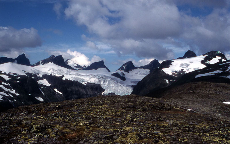 The first way from the east over Midtmaradalsbreen is probably the easiest. The route starts from Turtagrø and goes up to 'Bandet' and the Skagastølsbu shelter as per Hu.8. From 'Bandet' the route initially goes south west traversing slightly down across snowfields and rock for ½ km until it reaches the edge of the Midtmaradalsbreen glacier. It then veers south and traverses up across the crevassed glacier for ½ km.