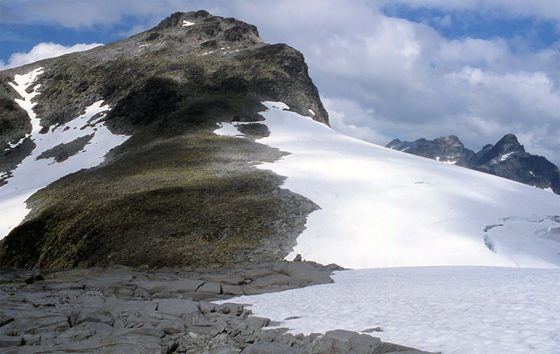 The route from Turtagrø is essentially a spring ski route, and a superb one at that. The route starts at Turtagrø and follows the route Hu.18 for 6 km to Ringsskard saddle. In April and early May there is substantial snow cover on this glacier and if one is skiing it is not necessary to go roped up, but experience is necessary. In the summer a rope is essential to cross this (or any) glacier. At Ringsskard the sharp pyramid of Stølsmaradalstind appears for the first time. From Ringsskard continue to follow Hu 18 across the almost flat Stølsmaradalsbreen glacier southwards for 2 km passing to the east of the mountain.