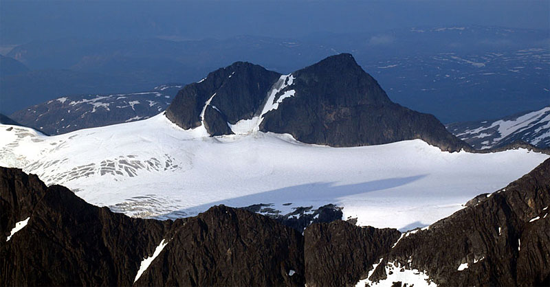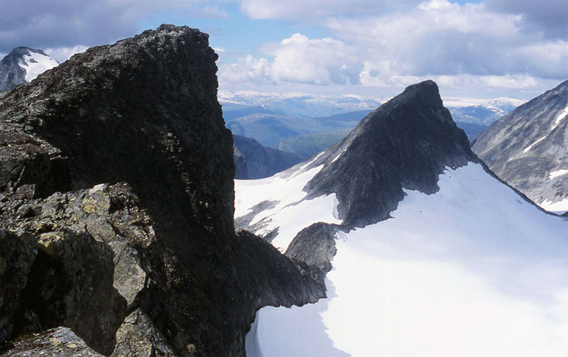 There is also a route up the north arête from Vikingskard. This route is 5 pitches with climbing up to grade IV. Vikingskard is most easily gained from Stølsmaradalsbreen glacier on the east side as opposed to the Gravdalen side.