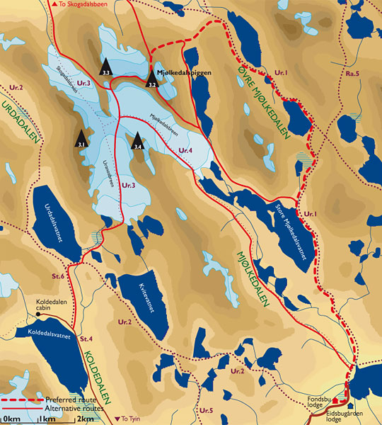 From Fondsbu lodge head north on the path Ur.1 which goes to Skogadalsbøen lodge. Head north for about 2½ hours passing Mjølkedalsvatnet lake until you reach a junction to the east of the steep face of Storegut, 1968m. Do not continue to Olavsbu cabin over a small saddle, but take the west fork down into the entrance of a deep U- valley whose floor is filled with a series of lakes, the Mjølkedalstjørni.