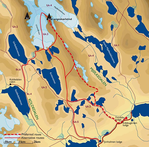 Leave the car park by Fondsbu lodge and return back up the road to Tyinholmen for 800 metres until you reach the cairn and the signpost indicating the start of the track to Skogadalsbøen lodge. Leave the road here and follow the marked path up through the cabins on the southwest side of the Sløtabekken stream for two km until you reach the Sløtatjønet lake.