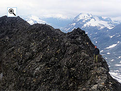 When you reach the summit ridge continue up to the west top. From here there is a 150 metre walk to the slightly higher east summit. Just before this summit there is a narrow and somewhat loose notch of iron rich rock.