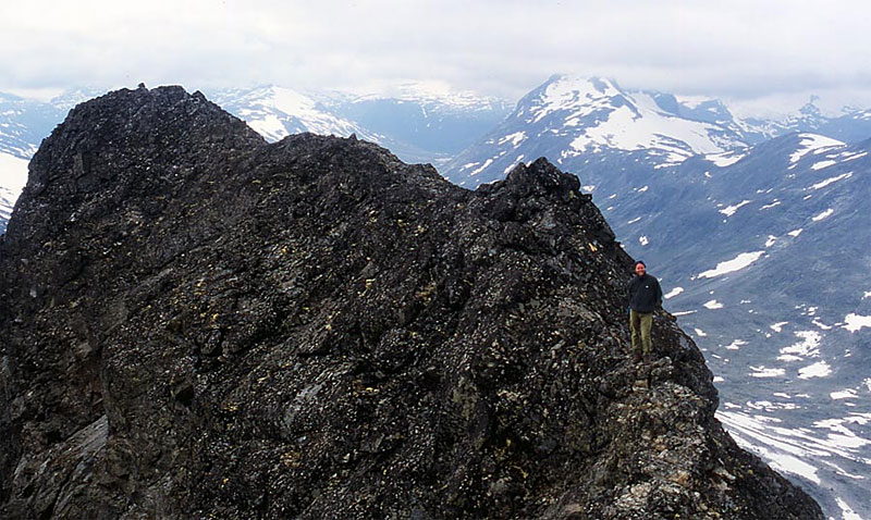 The route up the east arête of Rauddalseggi starts at the very east end of this massif. It is also possible to start this traverse, or indeed the ascent of Midtre Rauddalseggi via its north ridge from Gjendebu lodge. This is a longer day.