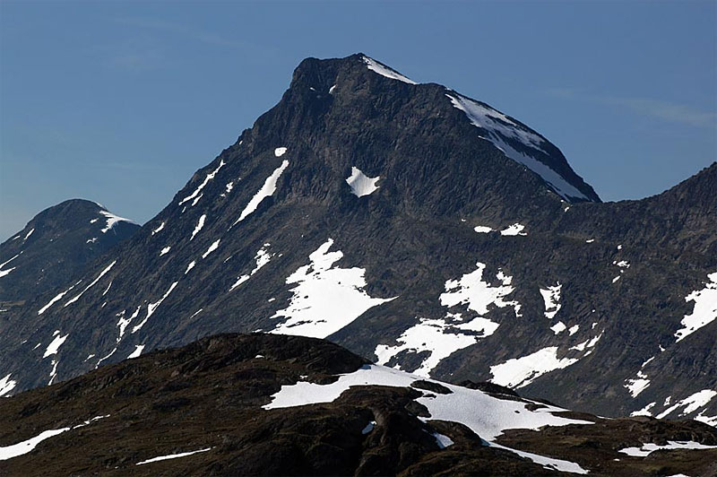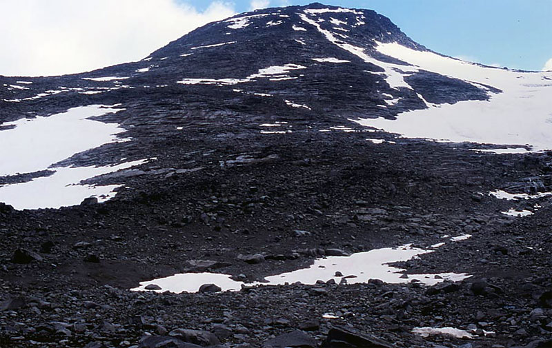 You will now be able to see the whole of the north ridge of Midtre Rauddalseggi, 2016m. This is the ridge to ascend. For the first 200m of ascent the going is easy, however for the next 300m of ascent the route is quite steep over bare rock covered in loose stone. Care must be taken to so as not to dislodge any loose stones and while crossing any of the bare rock slabs which may be slippery with water trickling down them. At last the gradient eases a touch and you suddenly reached the summit of Midtre Rauddalseggi. More details on this ascent are on the Midtre Rauddalseggi page.