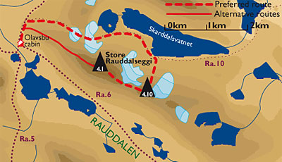 Store Rauddalsggi, 2168 metres, towers threateningly over the Rauddalen valley and Olavsbu cabin, where its west ridge looks particularly fearful. It is the highest mountain in the area and almost has a charisma that challenges you to climb it, especially when viewed from Olavsbu.