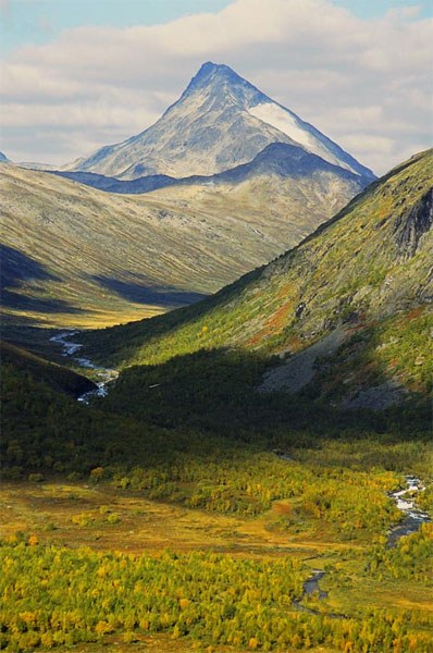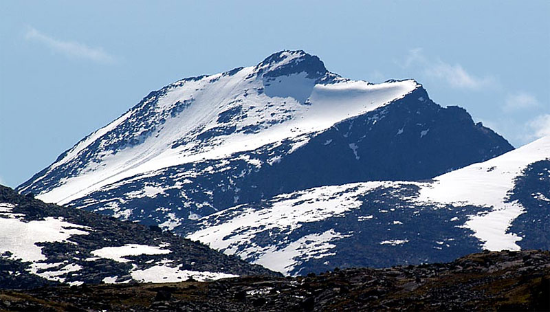 Skarddalseggi, 2159 metres, is the highest point of a long thin massif. This massif contains 2 mountains, Skarddalseggi and Skarddalstind, 2100m, which are separated by a glacier and a jagged saddle. To the north and south of this east-west aligned massif are deep valleys with green lakes.