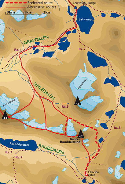 Much of this traverse will be on a snowfield. This will save you having to go down to the lake at 1456m and round its north side and then back up to Rauddalsbandet. From Rauddalsbandet it is 3 km south down the marked path Ra.8 path to Olavsbu cabin. If the return is made via Simledalsbandet the allow 6-7 hours return.