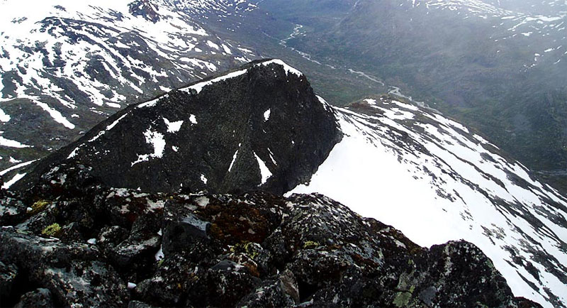 There two routes up Vestre Rauddalstind. The west ridge is the easiest way as is described in the main section. The other route is the east ridge from the saddle with Store Rauddalstind described here.