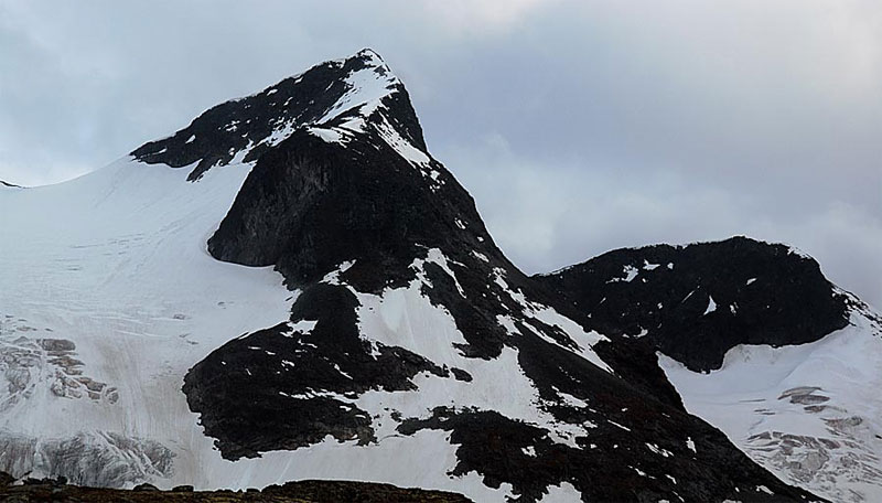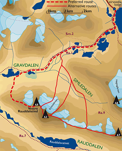 The return is by the same route. Alternatively continue the grand traverse of the whole ridge over Store Rauddalstind and Austre Rauddalstind and return to Leirvassbu lodge, via Simledalen valley, or finish at Olavsbu cabin, also via Simledalen, allowing 12-14 hours for either of the complete traverses.