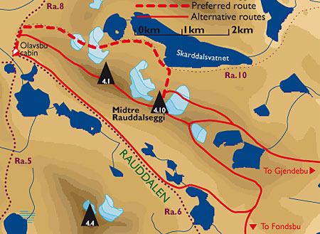 From the top of the gully it is a short easy walk to the summit of Midtre Rauddalseggi. However it is possible to avoid these difficulties by skirting the glacier on the north side well below the ridge at an altitude of about 1700 metres. This would mean traversing the north flank of Østre Rauddalseggi from the 2 lakes on the desolate plateau to the north ridge of Midtre Rauddalseggi, crossing the bottom of the glacier and avoiding the steep wall above its western edge.