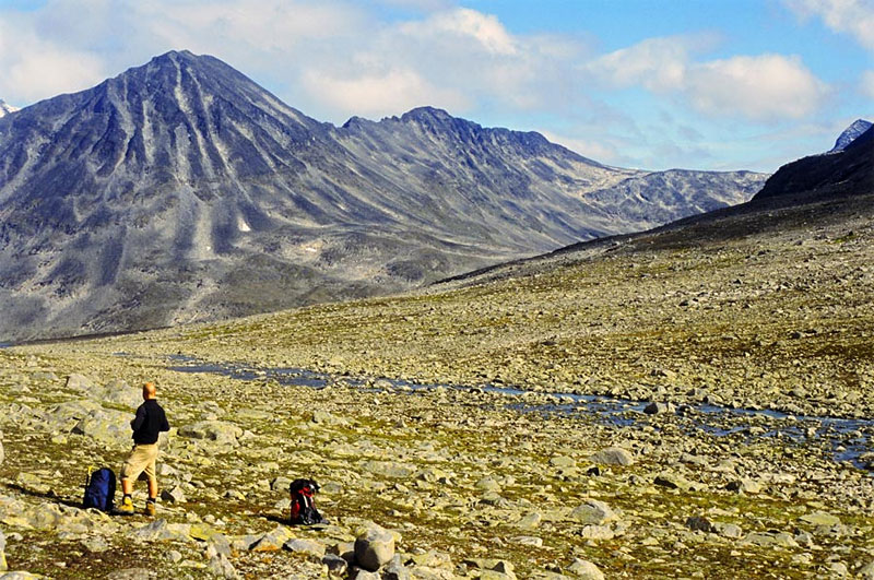 Once over the stream sidle round the bottom of the craggy north ridge of Semelholstind gently climbing stony tundra for a km until you reach another stream coming out of Semelholstjørni lake. Cross this stream and head up the east side of it where the terrain is less stony to the outflow, some 2½ hours after leaving Leirvassbu lodge.