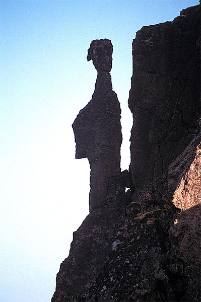 On the east side of the middle pinnacle is a fragile rock formation resembling a man with a rucksack and cap. The most southerly and pronounced of these 3 pinnacles is composed of red ironstone.