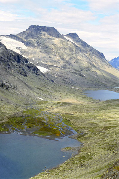 Leave Torfinnsbu lodge and follow the route Sl.3 west along Bygdin and then up north to Nedre Langedalstjernet, 1513m. Pass on the east side of this lake and then climb up to Øvre Langedalstjernet, 1673m. Pass this lake on either the west side if large snowdrifts and ice remain in the early summer at the foot of crags which drop straight into the lake at the northern end or on the east side along the boulders at waters edge sneaking under crags again on the northern side. From the north west corner of this lake clamber up steepish loose ground for 15 minutes to gain the saddle.