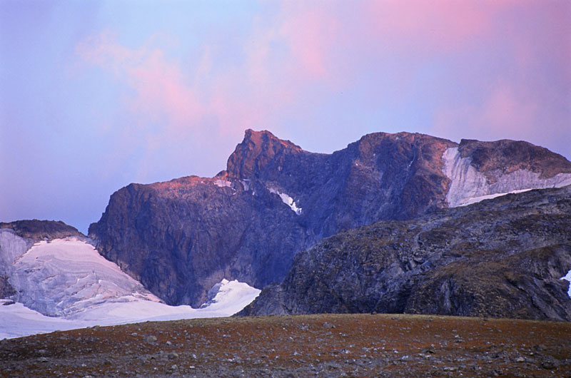 An ascent of the East Ridge starts at the saddle between Slettmarkhø and Slettmarkpiggen. Whether one approaches this saddle over the heavily crevassed Slettmarkbreen glacier to the north or the steep snow/ice fields and slabs on the south side the final approach to the saddle involves about 5 pitches of 45 degree ice or slab.