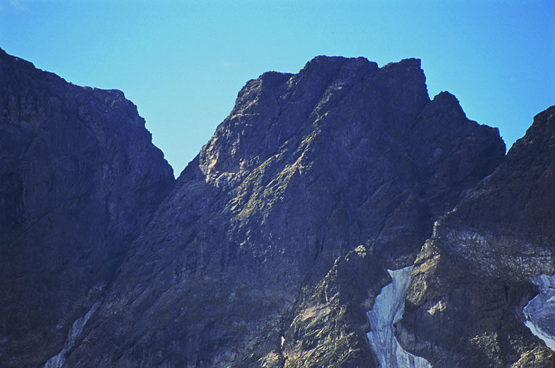 The descent from Midtre Torfinnstind can be one of two options. Firstly, back up to Østre Torfinnstind which involves a relatively simple descent back down to the saddle between the two mountains, and then up the ridge with the 15 metre grade III climb on it to Østre Torfinnstind, which is then descended by the main ascent route as described on the Østre Torfinnstind page.