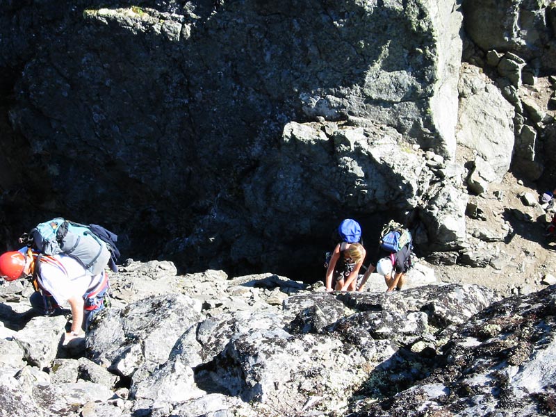 An easier alternative is to find a shelf on the south side of the main ridge, at the base of this 25 metre climb, and follow it west for about 10 metres to an awkward 1½ metre downclimb onto a rake full of loose scree.