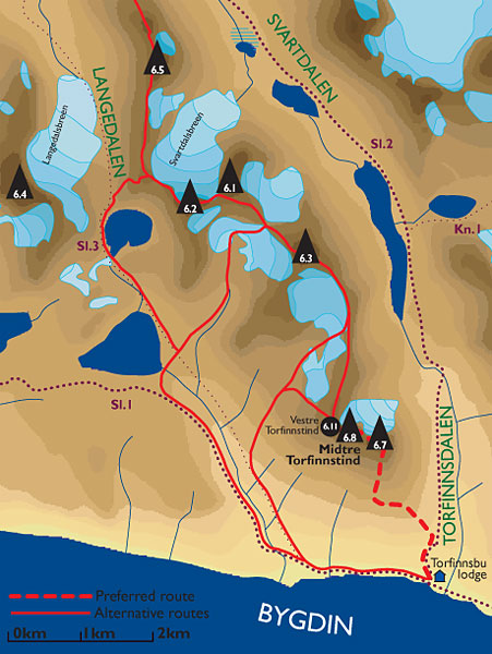 Leave Torfinnsbu lodge and ascend Østre Torfinnstind as described on the Østre Torfinnstind page.