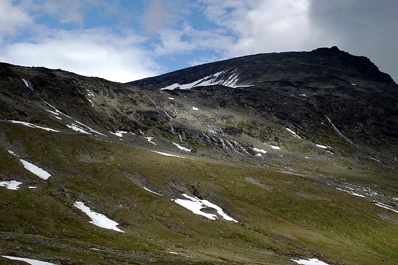 From the top of Vestre Torfinnstind continue the traverse westwards down the easy west ridge. After about 200 metres the ridge narrows to a very exposed arête for 7 metres. The worst section of this arête is best avoided slightly on the south side as some of the blocks which make up the crest are loose. From here head down to the small lake near the knoll marked as 1766 m. Then descend the steep grassy slopes just a little to the south-east of the main river that descends out of this bowl from the lake. Do not be tempted to take a short cut and descend the slopes closer to Vestre Torfinnstind as these slopes are steep and slippery.
