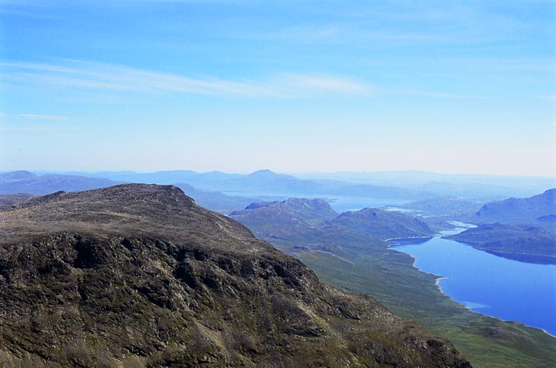 From this lake ascend for ¾ hour keeping to the west side of a large shallow bowl until you gain the highpoint 2088m on the main ridge main Kalvehøgdi ridge. From here continue north west for 1½ km to reach the top of Mugna. Here there fantastic views suddenly unfold. From Mugna turn south west for 1 km to reach the summit of Østre Kalvehøgdi, 2178m.