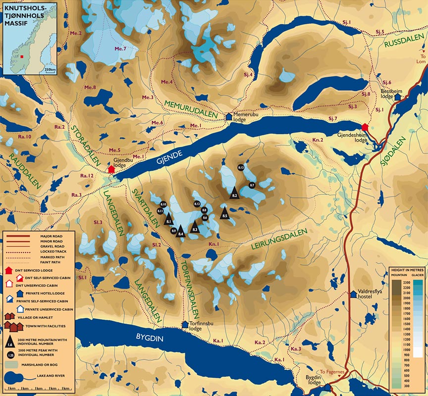 The mountains, peaks, walking routes and accommodation on the map below are not currently linked to further information.