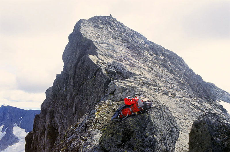 The descent is by reversing the route given below. The ambitious may also consider continuing the traverse to the west to the saddle with Vestre Leirungstind. The descent to the saddle involves some steep scrambling, one section on slightly loose rock. From the saddle descend the glacier to the south which has occasional crevasses, but still needs glacial experience and equipment. It is possible ascend Vestre Leirungstind from here, up its east ridge, but this involves a pitch of grade IV.