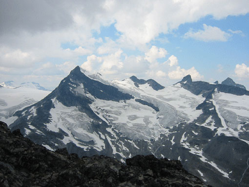 After regaining the glacier at the south end of the tower, the edge of the glacier is easily followed beside the arête for 100m until the gradient becomes considerably steeper. Here there is a short section of about 70 metres which is up to 40 degrees. Later in the summer this could be slightly icy. This steepness of this section could be reduced by making a traverse out to the centre of the glacier then back again. However, this traverse might entail going into a crevassed area. The arête during this section could be followed but is a difficult scramble and the glacier although steep is preferred. From the top of this steeper section it is a further easy 100m to the summit on the western of the two "ears".