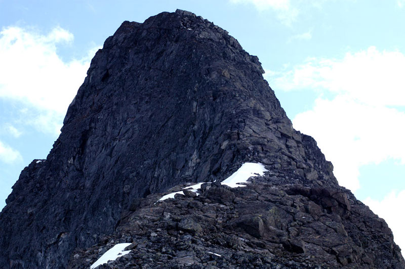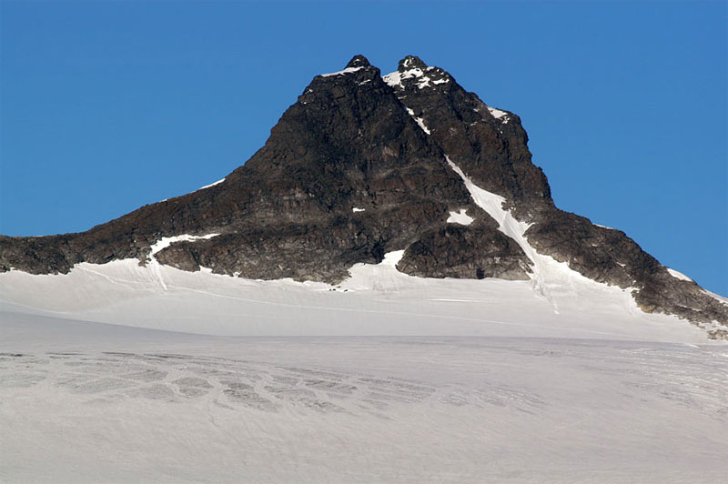 Saksi, 2189 m, is a spectacular twin peaked mountain which, along with Storebjørn and Store Smørstabbtind, dominates the jagged skyline in the central part of the Smørstabb massif. From its lofty top three steep arêtes descend and separate the encircling ice sheet into three distinct glaciers.