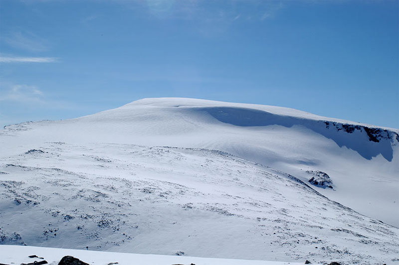 The route from the saddle with Spiterhø can either head south across moraine for a slow km losing 100m in height to the top of the Leirgrovi gully where it then ascends the west ridge as described below. Alternatively you can head east up easy stable moraine for a long km to reach the top of knoll 2077m. From here head further east for 200 metres (to avoid dropping down to the glacier) before veering south east and ascending easy slopes for a km to arrive at the eastern edge of a plateau where there is a stunning view over the Veobreen glacier to Veotind and beyond. This is were the glacier starts and for the next km it is followed in a southerly direction up a steepening slope with a couple of small crevasses across it. None the less glacial experience and equipment are necessary. Past the small crevasses the slope flattens out onto the summit plateau and the summit is just ½ km further south. For the entire 1½ km journey up the glacier the east side is fringed with huge cliffs. In the spring there are vast overhanging cornices over this drop and a good distance should be kept. In poor visibility this stretch is hazardous and exposed.