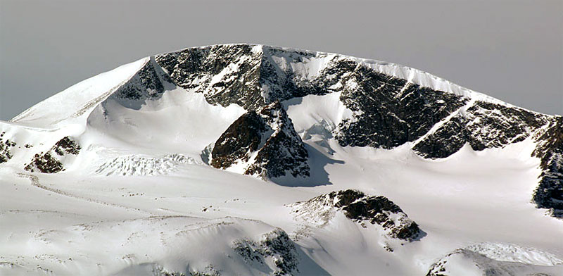At the top of this steeper section you at last arrive on the west ridge and some views begin to develop. This ridge is a 200 metre wide ramp initially. On the north is a steep drop down to the glacier, which you have now climbed above, and to the south are steep scree slopes down to Heillstugudalen valley. This ramp is generally covered in stable stones and after the previous 600 metres the going is easy and pleasant. The ramp continues up south east and after a km you reach the southern edge of the glacier. Follow this southern edge south east up for another km in easing terrain to the summit cairn.