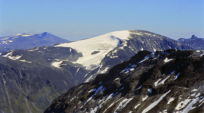 Leirhø, 2330m, is one of Jotunheimen's giants. It dominates the northern end of a 20 km ridge that never once drops below 2000 metres for its entire length. For its position and stature it is surprisingly non-alpine and only boasts one vertical face. The summit is a rounded plateau half covered in scree and the other half covered in a ice cap which flows into a small glacier.