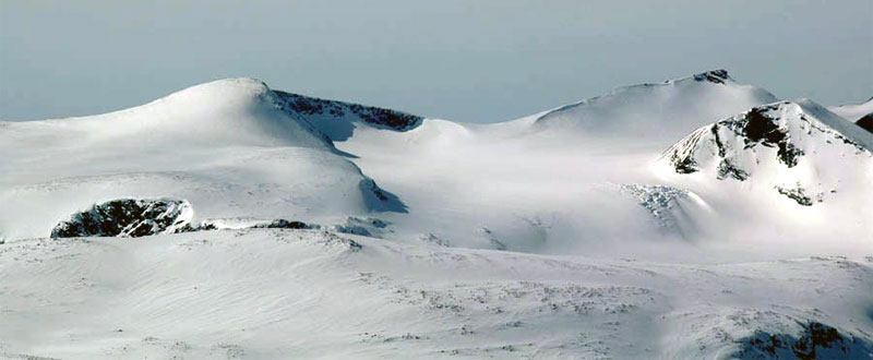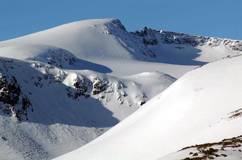 From the saddle there is a simple ridge walk up a gentle ridge covered in stable scree to the summit. This distance is less than a km and takes only 15 minutes. During the spring there are big cornices on the west side of the ridge and a respectful distance should be maintained especially in poor visibility. On the north side of the summit there is a overhanging drop on the north ridge to be wary of also. From this vantage point there is a unsurpassed view over this north eastern part of Jotunheimen and especially along the three ridges that radiate from the summit with three glacier filled valley between each ridge.