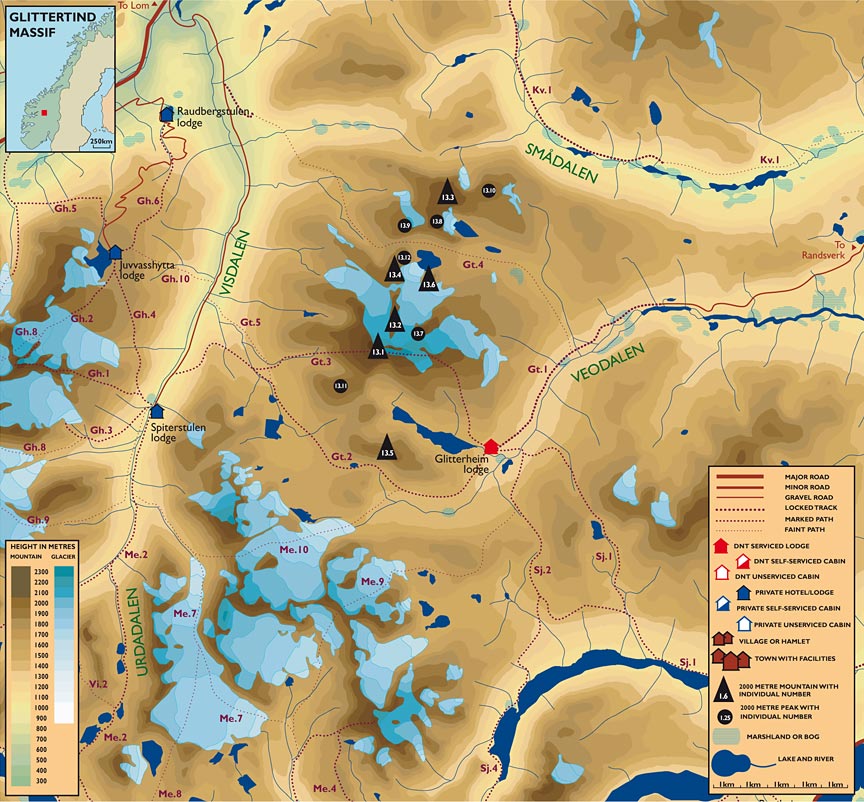 The mountains, peaks, walking routes and accommodation on the map below are not currently linked to further information.