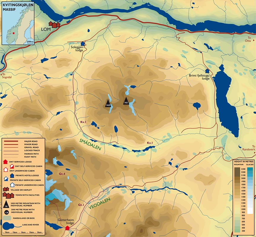 The mountains, peaks, walking routes and accommodation on the map below are not currently linked to further information.