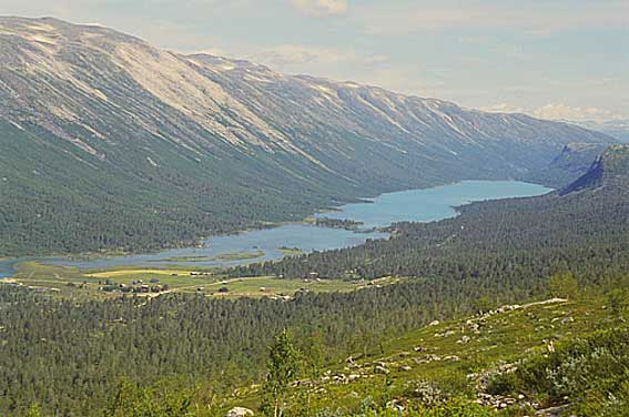 The north ridge which is a climbing of grade IV. From the lower end of Steindalen head up the steep slopes of the north buttress for 600 vertical metres. Much of the lower slopes are covered in a large steep snowfield during the early summer. The remainder of the ascent is across stable boulders until the top of this buttress is reaches at about 1990m elevation. From here the ridge narrows into an exposed arête with considerable drops on each side. After about a horizontal km the arête becomes much steeper and eventually vertical and very exposed for 2 pitches of grade IV before the summit.