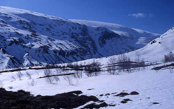 The snowfields of Storberka on the left, Hestbrepiggan in the centre and Låven in the distance from ytste Lundadalssætri in LundadalenIn the spring this path will be covered with snow and you are advised to park near the boom and attach ski skins and ski up to Netosætri. It may also be that the two km of gravel road from Kvanndalsvoll to Netosætri is also blocked with snow which will mean skiing along this short section also.