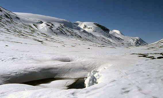 From this flat grassy meadow at about 1300m head directly north for about 4km until you reach height 1812m. From this hill (1812m) continue directly north towards the summit of Hesthøi for a further km crossing Runningsbre glacier to reach the saddle between Storberka and Hesthøi. When crossing this glacier no special equipment is needed but do not veer to the east at all (if anything keep to the west slightly) From this saddle continue directly north for another 1 ½ km up the gentle south side of Hesthøi to the summit.