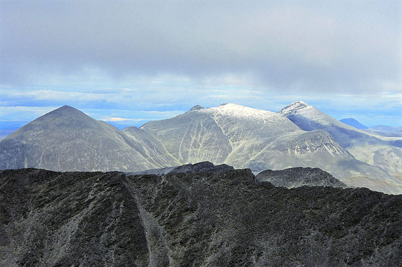 Høgronden, 2114 metres, is also a conical mountain which lies at the west end of a massif with another two mountains. Høgronden is the highest of the three mountains in this rounded massif and is connected to the other two by a rocky undulating ridge only has one short scrambling section. Høgronden is accessible from most directions, however there are two corries on the north side which are very steep. Between these corries is the north ridge which allows an easy route of ascent.