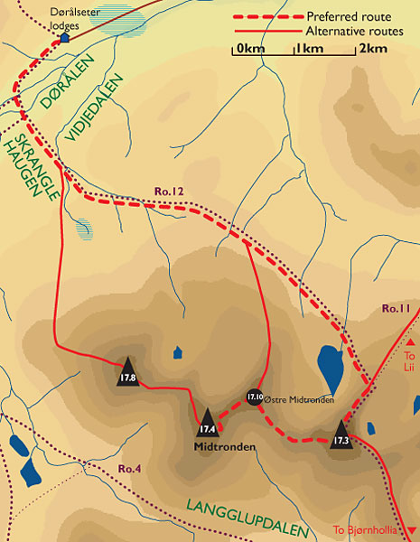 Midtronden can be climbed from Dørålseter directly by the north ridge to the lower of its peaks, Østre Midtronden. However, just before the summit there is mildly exposed passage which is compounded by loose blocks on the crest of the arête. As long as care is taken and there is no snow then this north ridge of Østre Midtronden it should not be a problem.