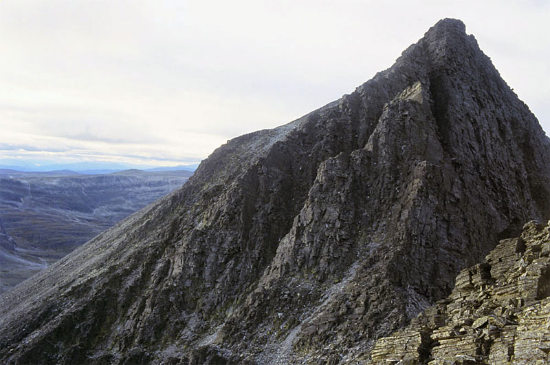 The most obvious route to ascend Sagtind is via the col between Steet and Storsmeden and then the south arête. However, this route is plagued by loose rock and the direct line up the arête needs climbing skills up to grade IV, but because of the poor rock quality is considered dangerous. I have still described an alternative to this arête which avoids the climbing section by traversing it on the west side. From the saddle between Storsmeden and Steet, which apparently is difficult and dangerous to access in the winter due to a double cornice, climb the 130 metres to the top of the knoll at about 1883 metres, which lies directly to the west. From the top of this knoll descend down about 80 metres to the north to a saddle which marks the start of the south arête of Sagtind. From the saddle there is a steep section which is best tackled on the east side initially bypassing a crag to gain the arête.