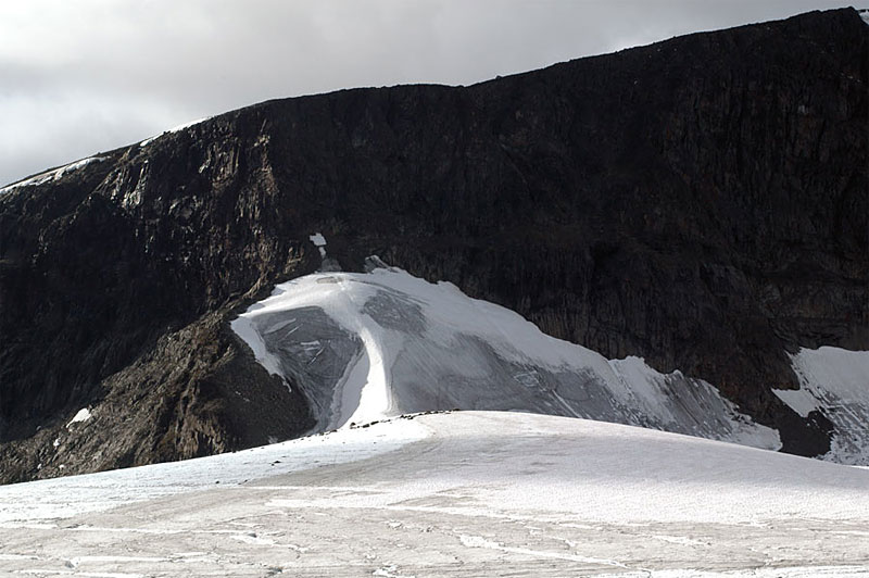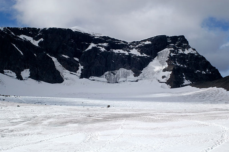 Giebmegáisi, 2104 m, is the highest mountain in Sweden, and the highest in Scandinavia above the Arctic Circle. The mountain is composed of two tops, the south top and the north top connected by an exposed ridge, partly covered in ice. The south top is the highest only because its 2070 metres are covered in a pyramid of ice. This ice pyramid recently was nearly 50 meters thick, but has melted significantly in the last years and in 2003 was only 34 metres thick. In contrast the north top is bare rock and is 2097 metres high. So should the ice pyramid continue to melt much more then the north top will take over the status of the highest mountain.