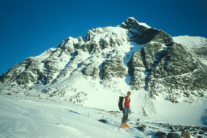 The bottom of the south east ridge is the top of triangle of the near vertical east face at the base of which lies the sydöstra Gaskkasbákti-glaciären, which was just ascended. Once on the ridge itself the climbing continues for another good ½ hour with some of it at grade III on a very fine and airy ridge to reach a false top at 2015 metres. From here it is easy to follow the lofty but flattish ridge for 200 metres to the summit. This route is demanding and exposed and needs a 60 metre rope, some slings and a normal rack of chocks. Descend via the east ridge as per the main route. Allow 8-10 hours round trip from Tarfalastugan cabin.